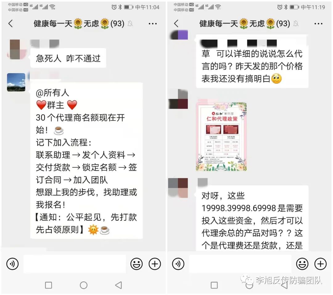 5月2號(hào)晚,我無(wú)意間在知乎網(wǎng)搜了一下仁X秘然堂,網(wǎng)上就跳出一條“大家說(shuō)招商后被騙的消息”,打開(kāi)消息后,全是代理哭訴,我有種被騙的感覺(jué),后來(lái)我就在原招商群【健康快樂(lè)每一天】,挨個(gè)去加人,最后有人終于通過(guò),一聊才知道大家都訴說(shuō)被騙了,后來(lái)我進(jìn)代理群后,才更加肯定了被騙的可能,有去年的代理打款后一直不給發(fā)貨的,關(guān)鍵去年和今年招商的內(nèi)容、包括直播視頻(連場(chǎng)景都一模一樣)和與大家每人微信聊天,訴說(shuō)他家中故事、家人照片都一模一樣,幾乎可以肯定都是群發(fā)編輯好的,而告知我們的直播實(shí)際都是提前錄播好的,最關(guān)鍵的是給大家群中承諾的都沒(méi)有兌現(xiàn)過(guò)。