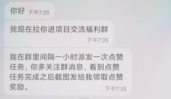 在這個(gè)軟件中,他發(fā)給我一個(gè)名片,說(shuō)是主管負(fù)責(zé)群的,讓我加她好友,拉我進(jìn)項(xiàng)目交流福利群,同時(shí)告訴我,群里隔一個(gè)小時(shí)會(huì)派發(fā)一次任務(wù)。每次發(fā)認(rèn)為,他還專門提醒我。