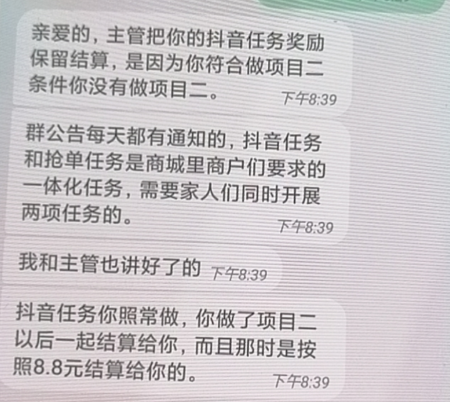 大概搶了十幾單,隔了兩天的樣子,再次進(jìn)群里面刷任務(wù),而且是他規(guī)定的時(shí)間,并截圖給她,竟然沒(méi)有提現(xiàn)。我就問(wèn)主管怎么回事?他說(shuō)做想繼續(xù)做,必須要做項(xiàng)目二,具體如何操作,你問(wèn)你的推薦人。