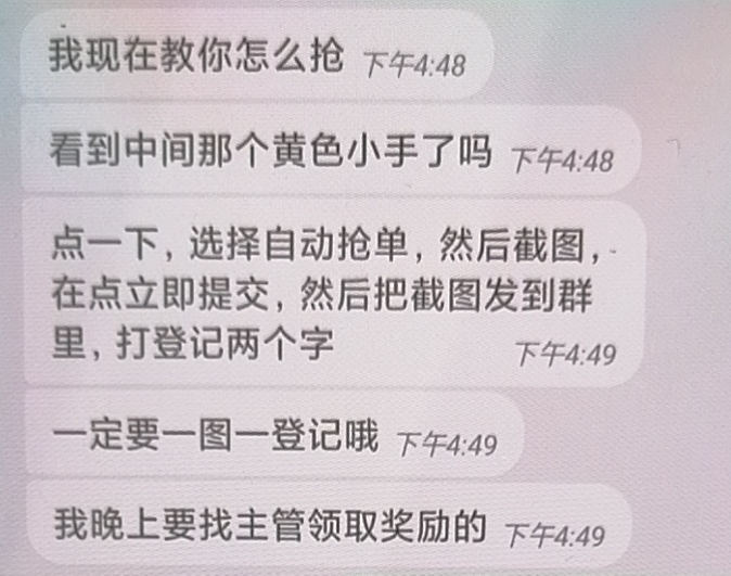 說(shuō)我運(yùn)氣好,她高興得不得了。并把每個(gè)訂單截圖搶到訂單的截圖發(fā)在第一個(gè)Enigmg,有主管拉的那個(gè)群里面曬單,當(dāng)然也有很多人曬單。直到給他搶滿60單,我看到訂單的傭金,他到手的傭金是500多。當(dāng)時(shí)我還疑問(wèn)呢,我說(shuō)會(huì)不會(huì)是騙人的哦?不要上當(dāng)了!
