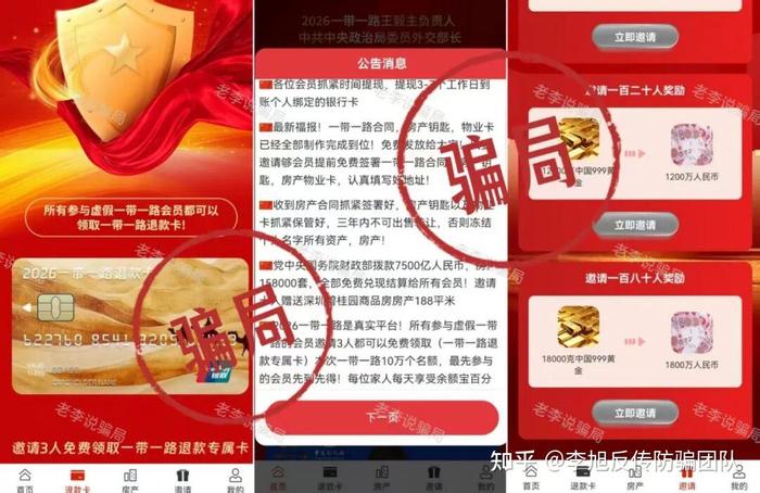 冒充官方項(xiàng)目,謊稱實(shí)名注冊(cè)可得百萬資產(chǎn)、黃金、房產(chǎn)等等,邀請(qǐng)新人獎(jiǎng)勵(lì)疊加,甚至還承諾為曾經(jīng)參與虛假“一帶一路”項(xiàng)目受騙者辦理所謂的“退款專屬卡”。