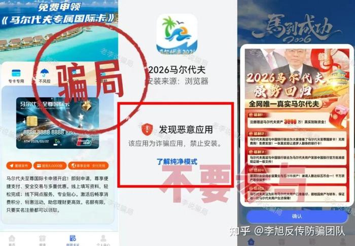 近期冒出來的新馬甲,和以往眾多打著“馬爾代夫”旗號(hào)的項(xiàng)目一樣,都是假冒“張健”的騙局。利用“至尊國(guó)家卡”、“黃金資產(chǎn)”等話術(shù)忽悠人。但這個(gè)APP在下載時(shí),手機(jī)安全軟件就會(huì)明確提示為“詐騙應(yīng)用”,禁止安裝。
