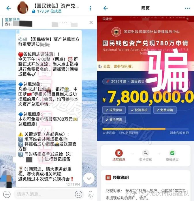 騙子謊稱國家撥款8600億民族資產(chǎn)專項資金,要給每個參與者發(fā)放780萬兌現(xiàn)款,還在詐騙群里利用AI制作虛假宣傳視頻,誤導不明真相的人登記身份信息。