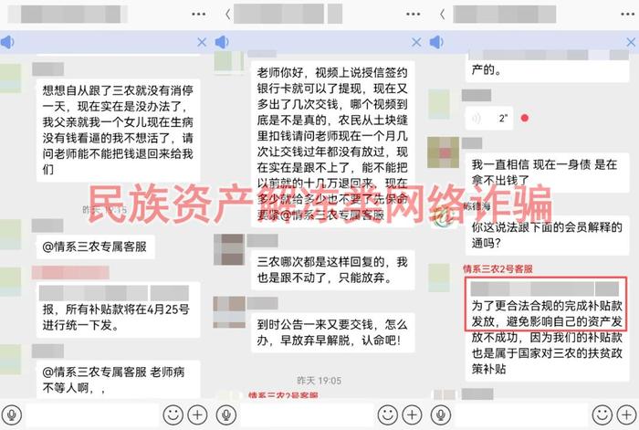 打著“國(guó)家項(xiàng)目”旗號(hào)的民族資產(chǎn)解凍類詐騙項(xiàng)目。通過(guò)非法手段收集參與者身份信息,謊稱給“報(bào)單”的人發(fā)放100萬(wàn)元,還要求進(jìn)行刷臉認(rèn)證。但是,這些承諾根本不可能兌現(xiàn),就是騙子用來(lái)忽悠人的工具。千萬(wàn)不要因?yàn)闀簳r(shí)不交錢,就免費(fèi)給騙子“打工”。