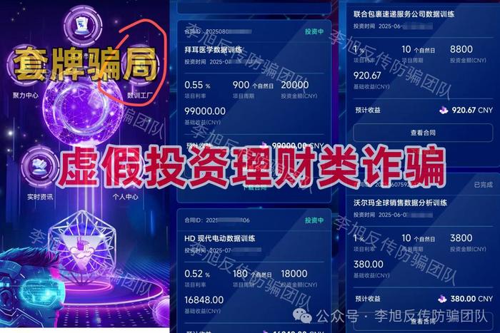 不法分子冒充某公司的旗號(hào),打著“人工智能+”“數(shù)訓(xùn)工廠”等名義,制作散布涉詐APP,虛構(gòu)推廣每日返息到期返利高額理財(cái)項(xiàng)目,該項(xiàng)目采用傳銷模式發(fā)展下線,收款賬戶為個(gè)人、第三方公司,涉嫌傳銷、詐騙、洗錢等。