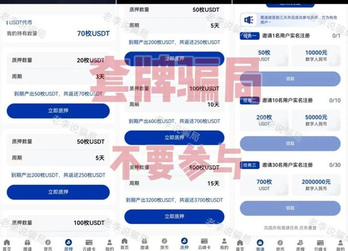 冒用“香港云峰金融集團(tuán)”名義制作假冒APP,以“質(zhì)押虛擬幣賺取收益”為誘餌,吸引不明真相的參與者。