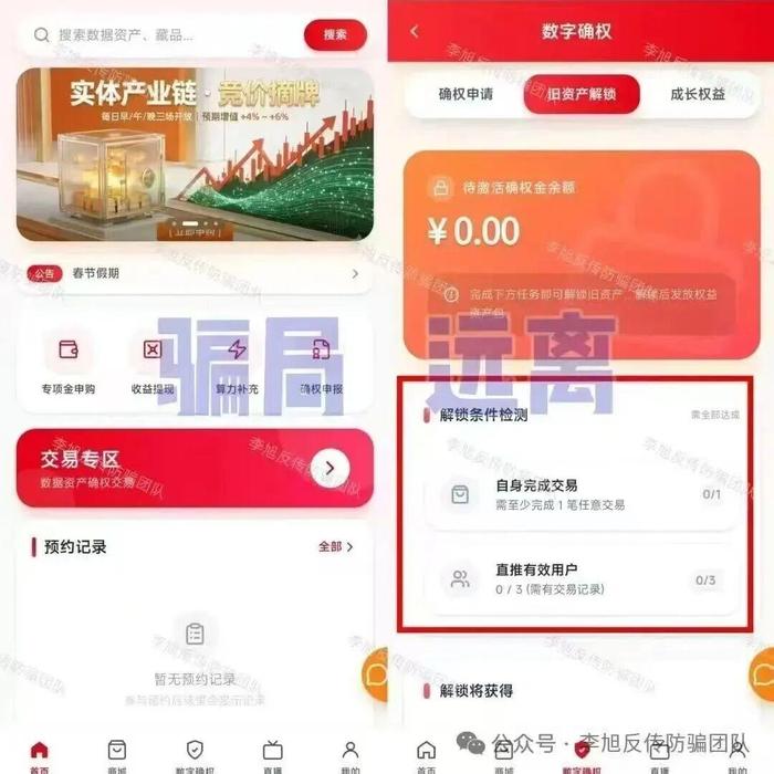 自“樹拍”爆雷后,該項(xiàng)目謊稱能夠釋放舊資產(chǎn),精準(zhǔn)吸引了大量急于挽回?fù)p失的老用戶。但是,想要解鎖舊資產(chǎn),必須至少完成一筆交易還要推薦3名新人。這明顯是針對(duì)特定受害人群體的、有預(yù)謀的二次收割。