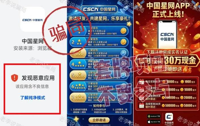 假冒“中國(guó)衛(wèi)星網(wǎng)絡(luò)集團(tuán)”,以解鎖“星火傳播大使”稱號(hào)的名義忽悠參與者填寫詳細(xì)個(gè)人身份信息,聲稱按照簽到天數(shù)發(fā)放現(xiàn)金、星幣等高額獎(jiǎng)勵(lì)。