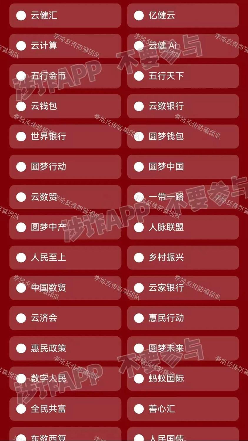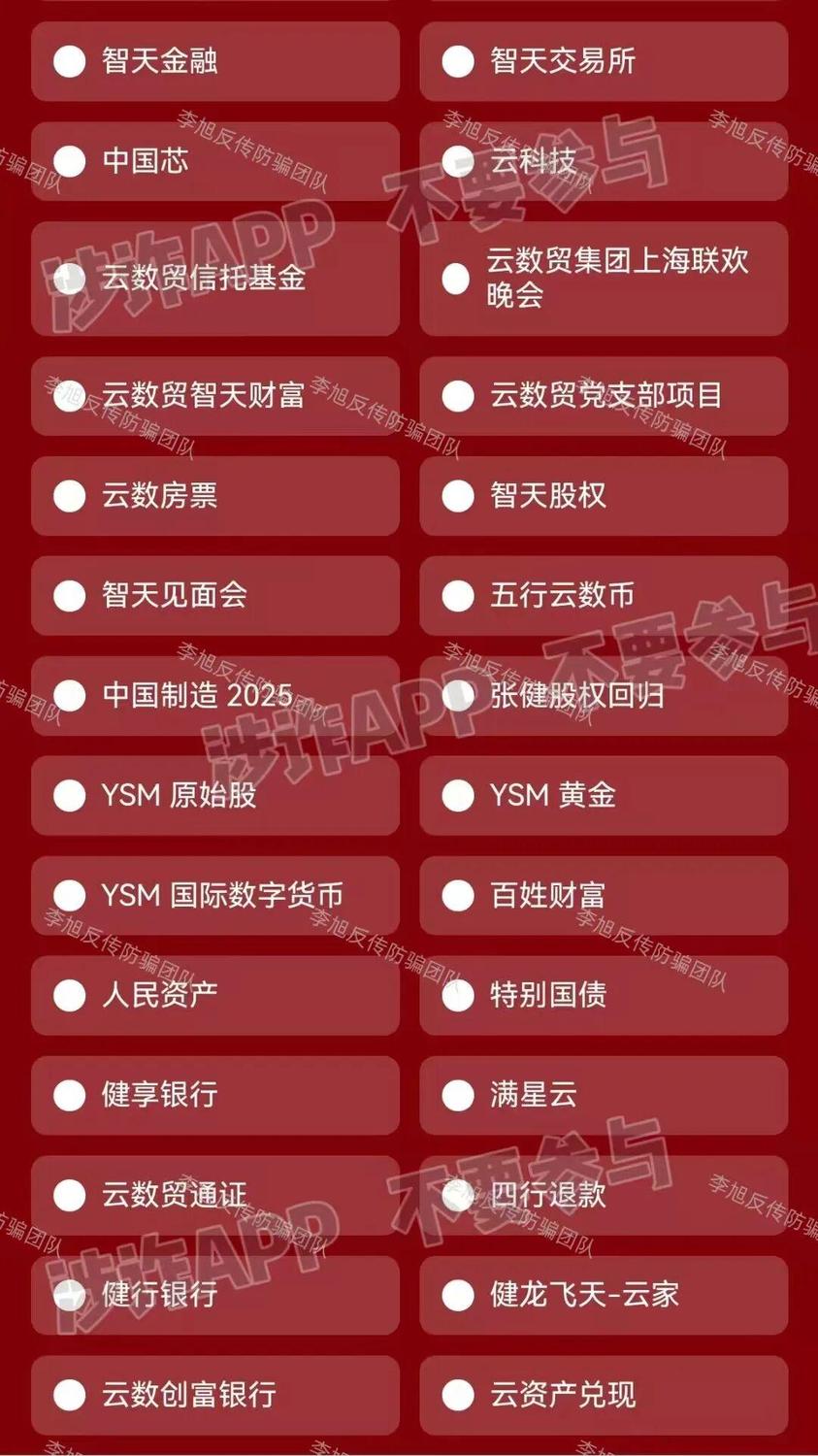 另外,在我們總結(jié)今天的案例過程中,發(fā)現(xiàn)了堪稱“騙子界最有自知之明”的一位。一個打著“清退”旗號的虛假軟件中,羅列了大量號稱可以“清退”的項目。雖然“退賠”是假,但這個名單卻像一份“騙局指南”,上面列出的名字,幾乎都是無法兌現(xiàn)任何承諾的陷阱和資金盤。這也從側(cè)面印證了這些項目的性質(zhì)。騙子自己,有時反而“最懂行”。圖片奉上,大家可以自行查看,盡早遠離!