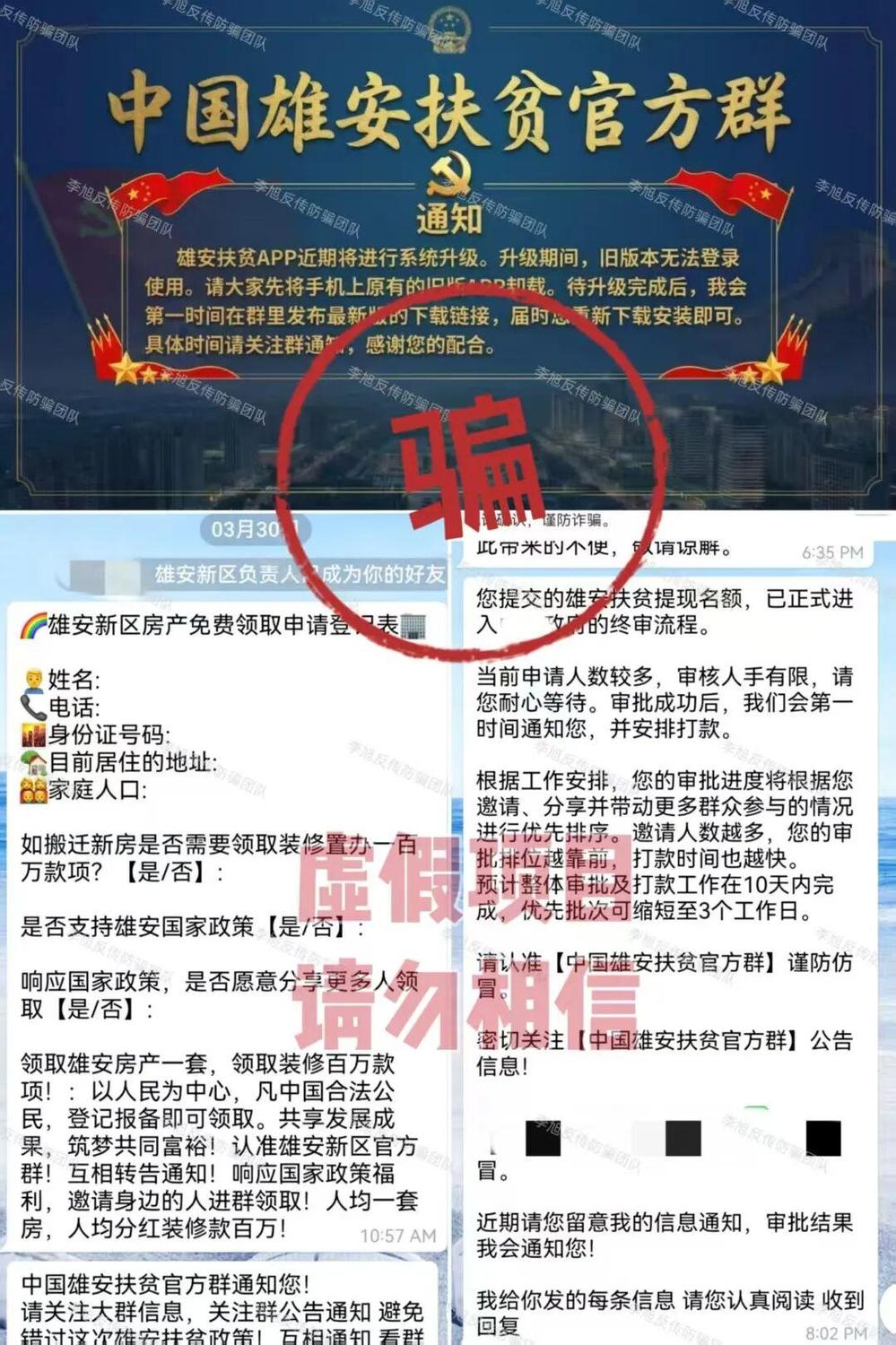 蹭“雄安新區(qū)”政策熱點出現(xiàn)的虛假項目。打著“國家”旗號,聲稱參與者可免費領(lǐng)取巨額扶貧款和房產(chǎn),以此套取用戶信息。