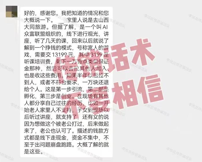 發(fā)表時(shí)間:2026-04-23 18:55作者:李旭反傳銷來源:李旭反傳防騙團(tuán)隊(duì) 您是否曾在微信群里見過‘國(guó)家補(bǔ)貼’‘海外分紅’的誘人消息?是否有人向您推薦過‘零風(fēng)險(xiǎn)、高回報(bào)’的投資項(xiàng)目?是否接到過自稱‘官方工作人員’的陌生來電? 如果您的回答是‘有’,那么請(qǐng)務(wù)必提高警惕! 最近,我們接到大量網(wǎng)友咨詢,不少中老年朋友深陷騙局,辛苦積攢的養(yǎng)老錢血本無(wú)歸。 今天的這8個(gè)近期高發(fā)的騙局項(xiàng)目,它們冒充國(guó)家政策、偽造官方文件、編造暴富神話,專門瞄準(zhǔn)中老年人的“錢袋子”。請(qǐng)大家務(wù)必擦亮眼睛,寧可錯(cuò)過,不可信錯(cuò)! 1、虛構(gòu)的“圓夢(mèng)馬爾代夫”APP 冒充“云數(shù)貿(mào)張健”,利用大家對(duì)“云數(shù)貿(mào)騙局”的執(zhí)念,編造了“兌付資產(chǎn)”、“清債”、“股權(quán)分紅”等謊言吸引所謂的“云家人”。 APP只能通過陌生鏈接下載,安裝提示未備案。 ![]() 在“云數(shù)貿(mào)張健”相關(guān)的騙局項(xiàng)目當(dāng)中,“馬爾代夫”系列可以說是騙子們最愛用的噱頭之一。目前已衍生出多個(gè)版本,都是境外詐騙團(tuán)伙換的馬甲,務(wù)必高度警惕。 ![]() 2、虛構(gòu)的“全民醫(yī)療補(bǔ)助”項(xiàng)目 冒充“醫(yī)療保障局”的工作人員,在某境外聊天軟件中,以“領(lǐng)取健康扶助金”為由,套取用戶個(gè)人信息和銀行卡。一旦提交,不僅領(lǐng)不到所謂的補(bǔ)助金,反而可能在不知情的情況下,成為詐騙分子“洗錢”鏈條中的一環(huán),甚至因此承擔(dān)法律責(zé)任。 凡是索要銀行卡密碼和驗(yàn)證碼的“官方人員”,一律拉黑。 ![]() 3、虛構(gòu)的“圓夢(mèng)國(guó)債” 利用“免費(fèi)領(lǐng)取550萬(wàn)國(guó)債”作為誘餌,大量收集用戶個(gè)人信息。 在此鄭重提醒:正規(guī)國(guó)債僅通過銀行、證券公司等官方渠道發(fā)行,絕不會(huì)通過社交軟件私下贈(zèng)送,天上絕不會(huì)掉百萬(wàn)國(guó)債! 所謂的“百萬(wàn)國(guó)債免費(fèi)送”,純屬無(wú)稽之談,目的是騙取大家的隱私做非法用途。 ![]() 4、AIC小龍蝦共識(shí)協(xié)議 打著“Web4時(shí)代AI共識(shí)協(xié)議”的噱頭,忽悠人充值USDT(虛擬幣)兌換代幣進(jìn)行炒作,是典型的虛擬幣殺豬盤騙局。 在此鄭重提醒:在我國(guó),任何虛擬幣相關(guān)業(yè)務(wù)活動(dòng)都屬于非法金融活動(dòng),資金不受法律保護(hù),參與此類項(xiàng)目,最終只會(huì)血本無(wú)歸。 八部門:虛擬貨幣相關(guān)業(yè)務(wù),境內(nèi)一律禁止! 5、虛構(gòu)的“中國(guó)華夏會(huì)”APP 前身是“YSM”APP,利用528萬(wàn)資金吸引大家實(shí)名,套取信息。隨后謊稱完成邀新任務(wù)可獲得會(huì)員證,并根據(jù)拉新人數(shù)劃定等級(jí),發(fā)放所謂的股權(quán)、團(tuán)隊(duì)金等等。 這些只存存在軟件后臺(tái)的一串?dāng)?shù)字卻引得不少中老年朋友蜂擁而至,但最終等來的只能是以兌現(xiàn)之名出現(xiàn)的各種費(fèi)用。屆時(shí),這些收益無(wú)法提現(xiàn)又棄之可惜,參與者只能一步步進(jìn)入早就設(shè)定好的圈套。 6、套牌的“云聯(lián)聚”APP 冒充廣東“云某某科技”公司的名義,打著“人工智能”“工業(yè)物聯(lián)網(wǎng)”等旗號(hào),向參與者兜售高額返利的虛假理財(cái)項(xiàng)目。承諾的收益完全不符合市場(chǎng)規(guī)律。維樂維持項(xiàng)目運(yùn)營(yíng),設(shè)置多層級(jí)返利機(jī)制,以高額回報(bào)鼓勵(lì)用戶拉新。 同時(shí),該軟件無(wú)法通過正規(guī)應(yīng)用商城下載,只能通過上線給的鏈接、二維碼下載,下載提示未經(jīng)過ICP備案。 符合虛假投資理財(cái)?shù)奶卣?。一旦新人不足,收益難以兌付,關(guān)網(wǎng)也只在一瞬間。 ![]() 7、虛構(gòu)的“國(guó)家補(bǔ)貼中心”APP 冒充國(guó)家背景,以領(lǐng)取補(bǔ)貼的名義,通過小額紅包吸引大家注冊(cè)拉新。近期開始以“發(fā)放補(bǔ)貼”為由,要求繳納所謂的“辦理費(fèi)”。 經(jīng)核實(shí),該項(xiàng)目APP未通過備案,服務(wù)器地址也在境外。 ![]() 8、山西大同財(cái)富聯(lián)盟13199傳銷 打著“財(cái)富聯(lián)盟”的旗號(hào),謊稱投資13199元加入,出局可獲得300萬(wàn)的回報(bào)。 該組織實(shí)際是“民間自愿互助理財(cái)49800傳銷”的最新變種。不過是將投資款拆解為“13199元+50000元”的組合,用“小投入試錯(cuò)”的名義降低新人戒心。其洗腦流程固定、資金要求明確、層級(jí)機(jī)制清晰、虛假背書常見。大家千萬(wàn)要守住理性,拒絕誘惑,才是防騙最有效的武器。 “財(cái)富聯(lián)盟”13199傳銷騙局現(xiàn)身山西大同,4個(gè)視角帶您深度揭秘 ![]() 9、河南信陽(yáng)48000傳銷 不再大肆宣揚(yáng)所謂“國(guó)家項(xiàng)目”,強(qiáng)調(diào)“模式”與“互助”,主要宣講“公排跳排,大盤小盤”。打著各種旗號(hào)在高檔酒店或者出租屋對(duì)新人進(jìn)行洗腦。號(hào)稱“就算一個(gè)人不發(fā)展也可“保本彈出”,迷惑性極強(qiáng)。 該組織通常打著“師生文化”“億源系統(tǒng)”“宏航系統(tǒng)”“天悅系統(tǒng)”等多個(gè)旗號(hào)運(yùn)作,近期各個(gè)系統(tǒng)都開始加入某品牌的