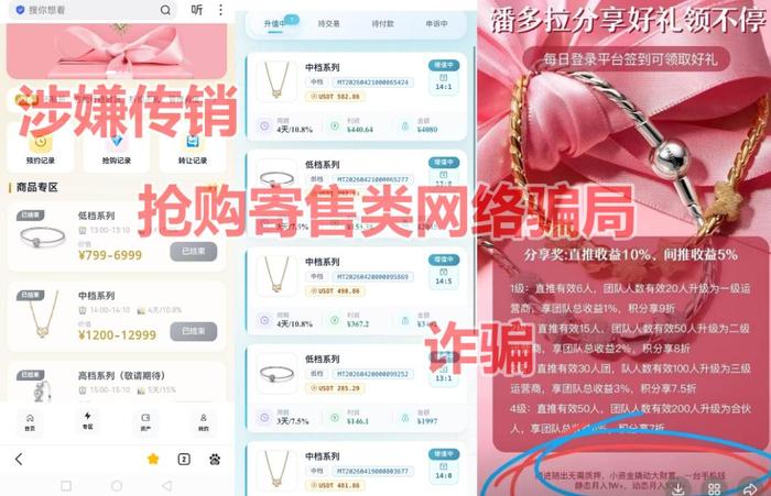 近日,網(wǎng)友反饋一個(gè)名為“潘多拉”的電商平臺(tái),很多大學(xué)生/寶媽參與其中,參與者每天預(yù)約搶購(gòu)產(chǎn)品,到期后轉(zhuǎn)售該產(chǎn)品進(jìn)行寄售,進(jìn)而獲得高額返利,同時(shí)采用傳銷模式發(fā)展下線,涉嫌傳銷、詐騙。