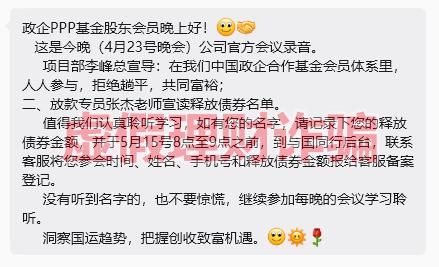 近日,網(wǎng)友反饋,一個(gè)冒充“中國(guó)政企”公司的理財(cái)詐騙項(xiàng)目,依然在通過各種途徑進(jìn)行洗腦,虛構(gòu)推廣“債券”“增發(fā)股”等高額返利理財(cái)項(xiàng)目實(shí)施詐騙。